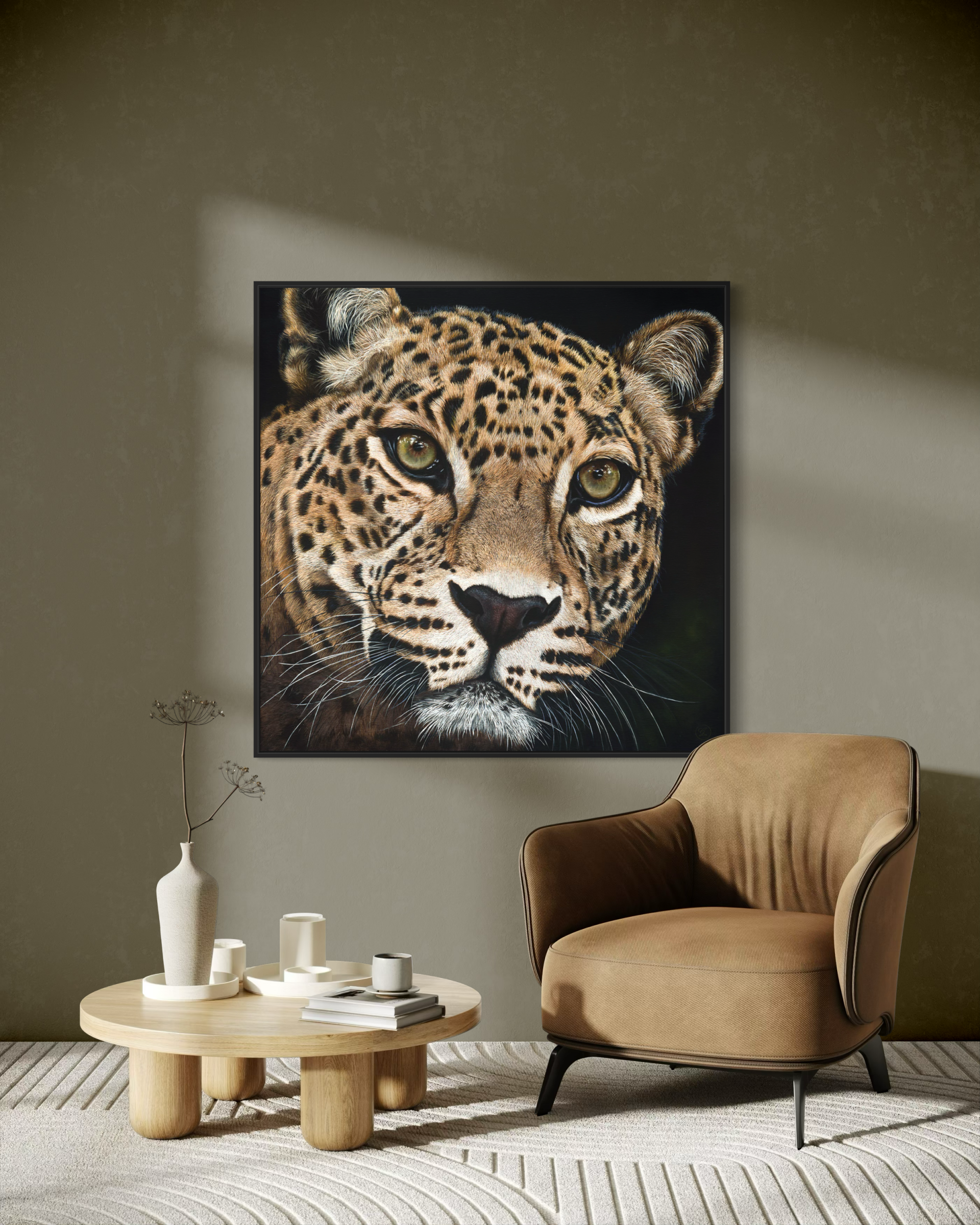 Elke penseelstreek is een eerbetoon aan dat moment. Laag voor laag heb ik zijn rijke, gedetailleerde vacht, de diepte van zijn gouden ogen en zijn stille kracht vastgelegd. Dit schilderij draait niet alleen om een luipaard—het brengt zijn ziel tot leven op doek.