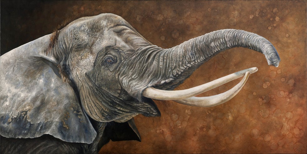 Dit is mijn schilderij "Floris", waarin de kop en slurf van een olifant centraal staan. Het is een olieverfwerk van 160x80 cm, ontstaan vanuit mijn diepe fascinatie voor de unieke texturen en vormen van dit dier. Het proces was er een van geduld, waarbij ik met veel lagen verf een rijke diepte en detail heb gecreëerd.