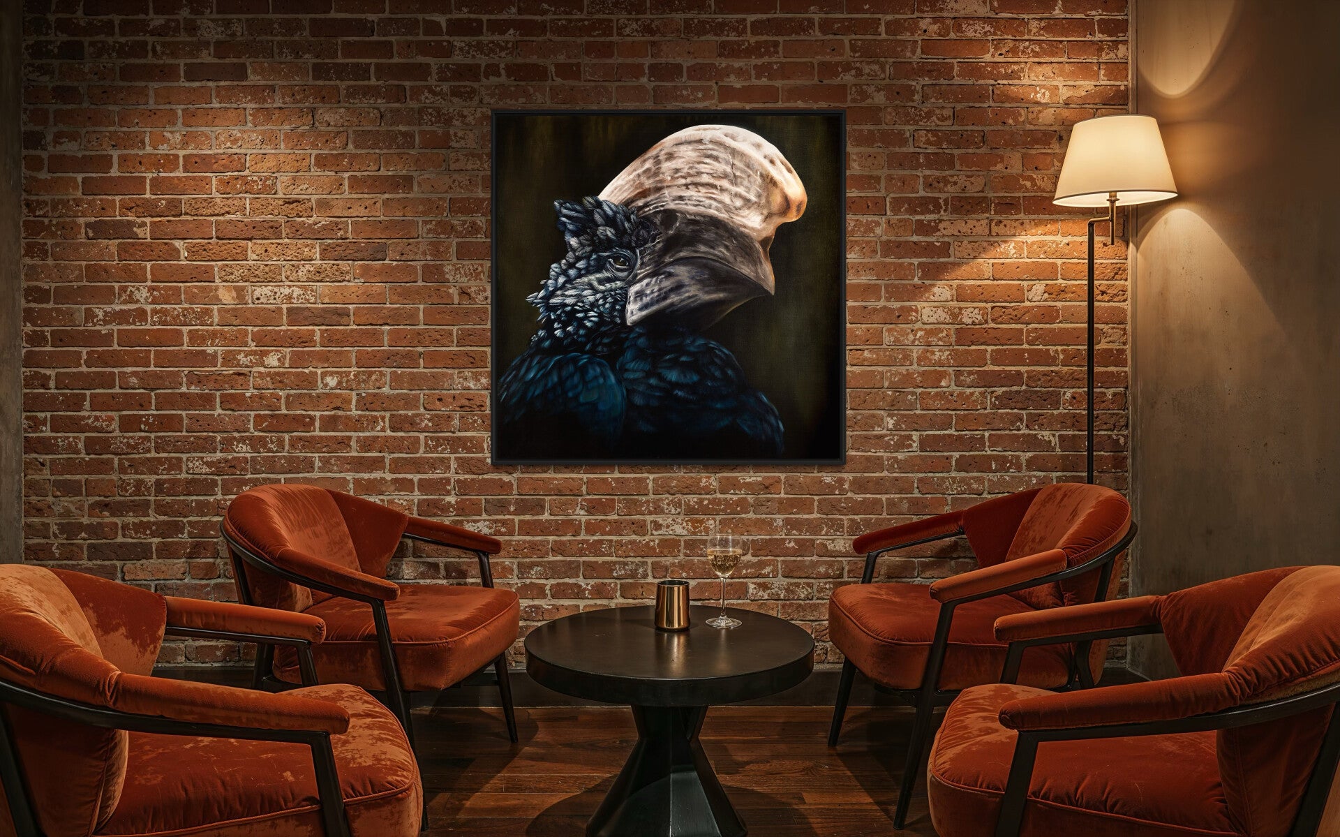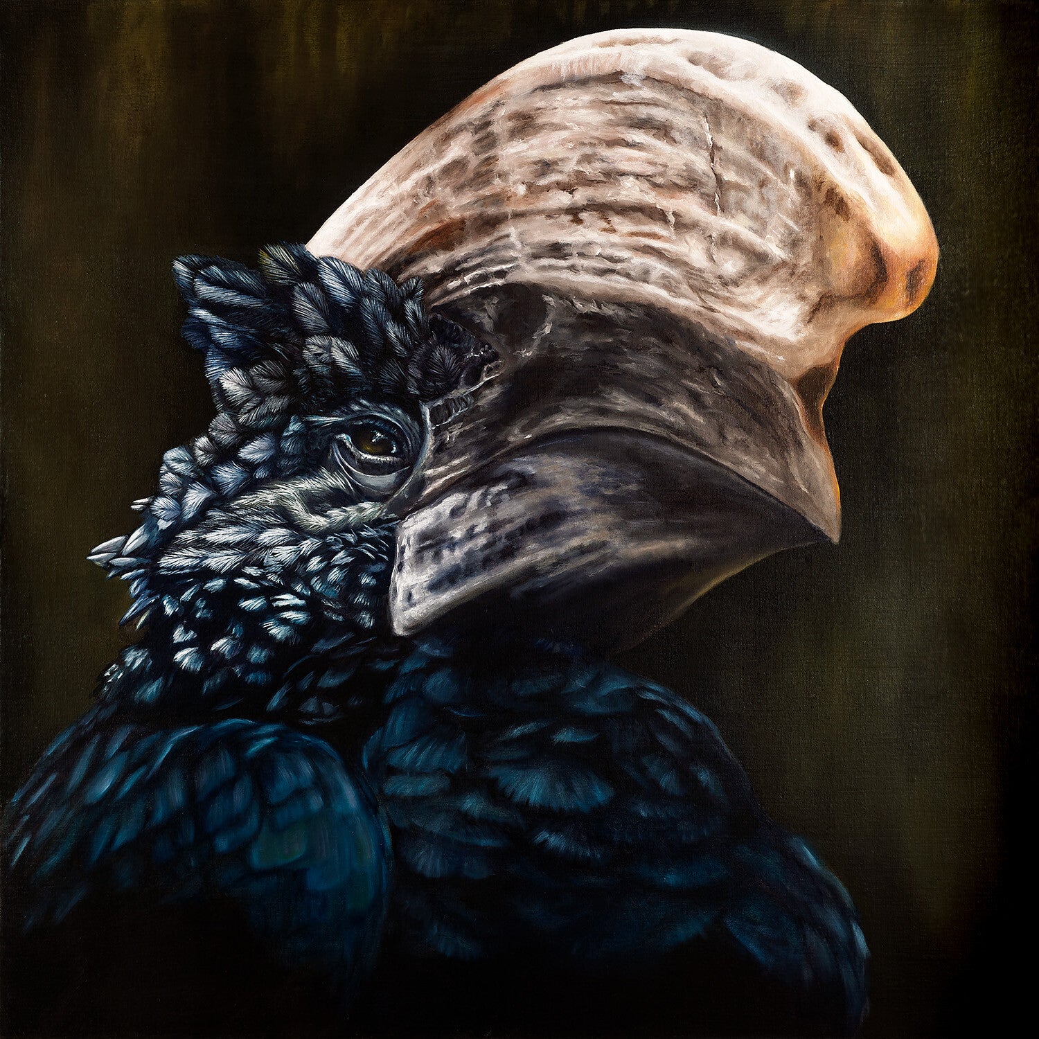 Grumpy is een realistisch olieverfschilderij van 90 x 90 cm met de kop van een zilverwangneushoornvogel tegen een donkere achtergrond. Door het diepe kleurgebruik komt de karakteristieke hoorn en snavel krachtig naar voren en krijgt het schilderij een intense, bijna verstilde uitstraling.
