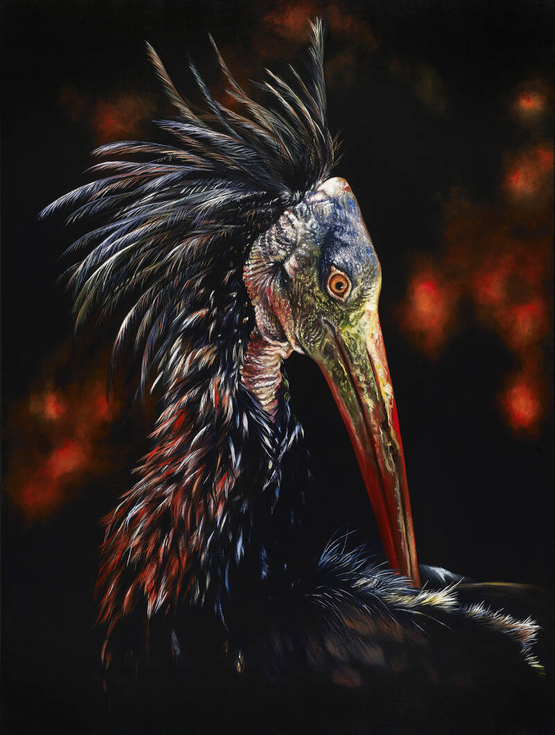 KIKI vangt de kracht en het mysterie van deze bijzondere vogel in dramatisch licht. De rode gloed over zijn veren contrasteert scherp met de zwarte achtergrond, waardoor de ibis bijna van het doek lijkt te springen. Het spel van licht op de kale kop en lange snavel voegt een extra dimensie toe, waarbij paarse, rode en goudtinten elkaar subtiel afwisselen.