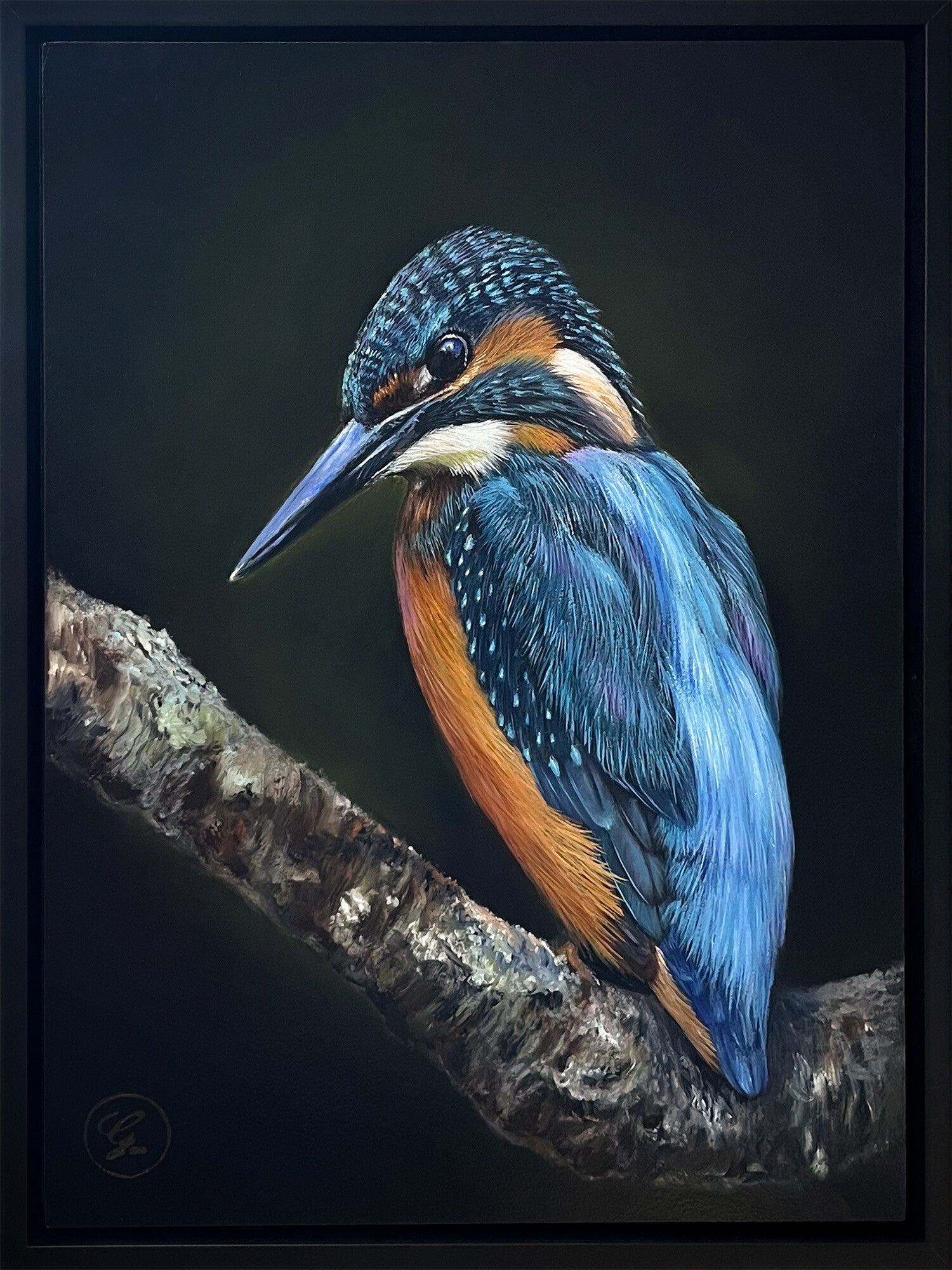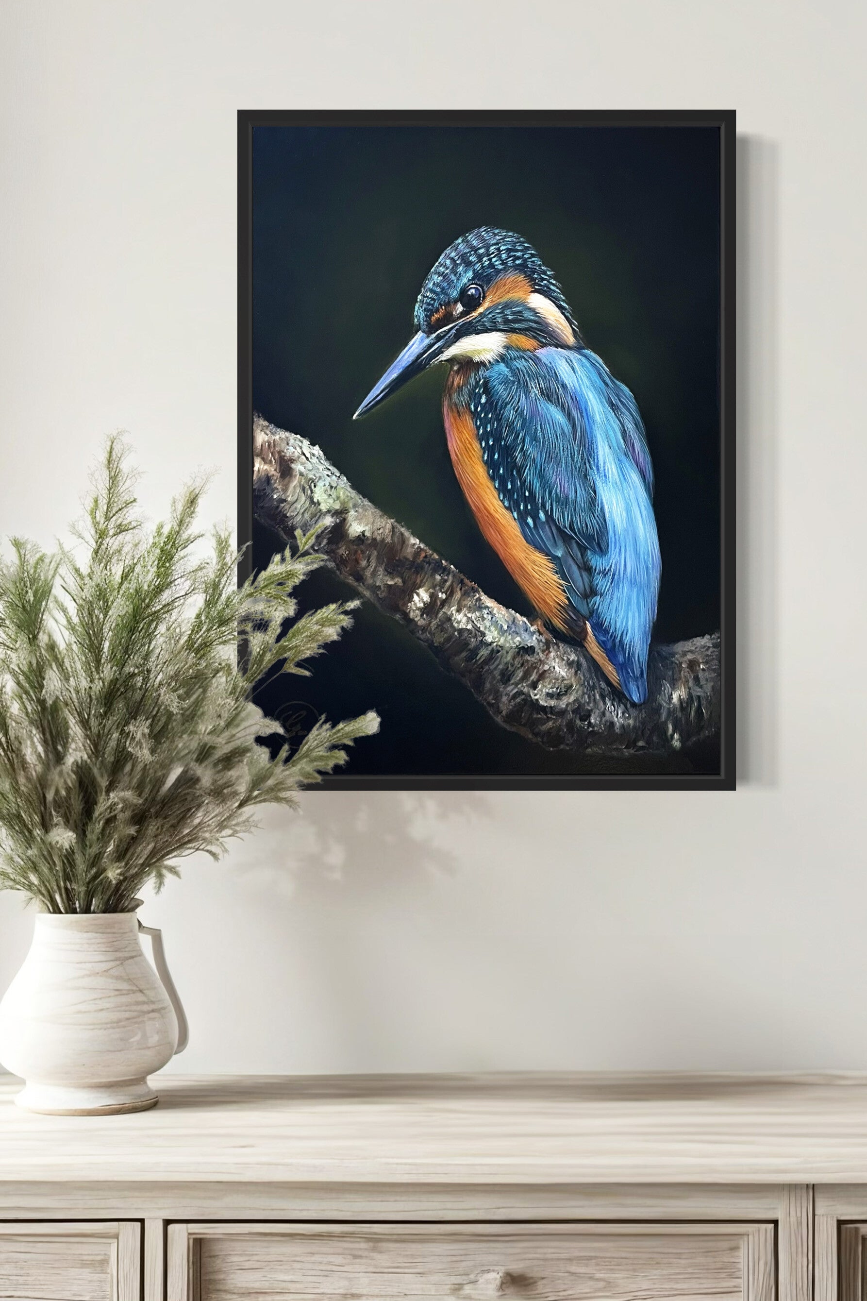 Dit unieke schilderij van een ijsvogel (30x40 cm, olieverf op paneel) is ingelijst in een stijlvolle zwarte baklijst die moeiteloos in elk interieur past.