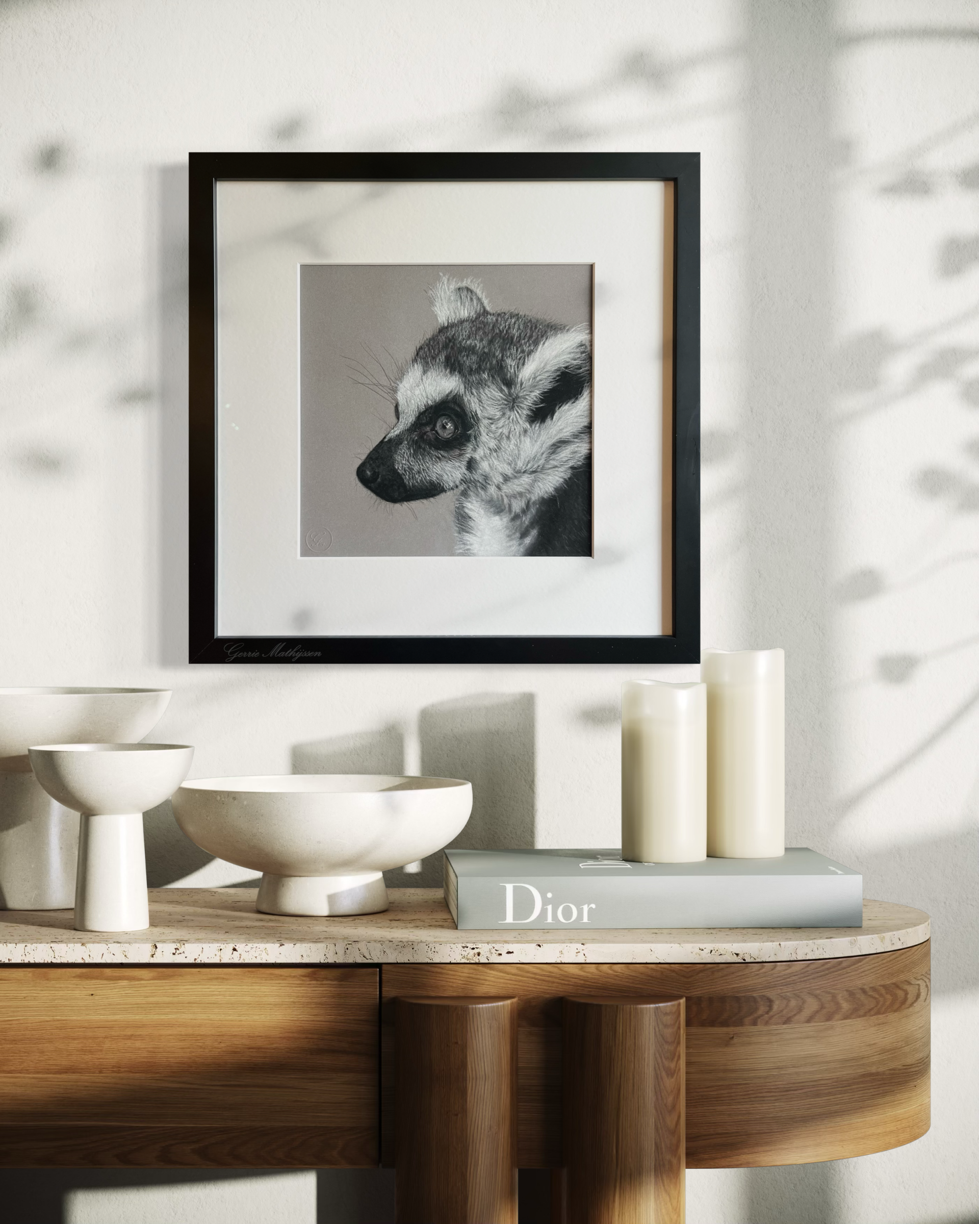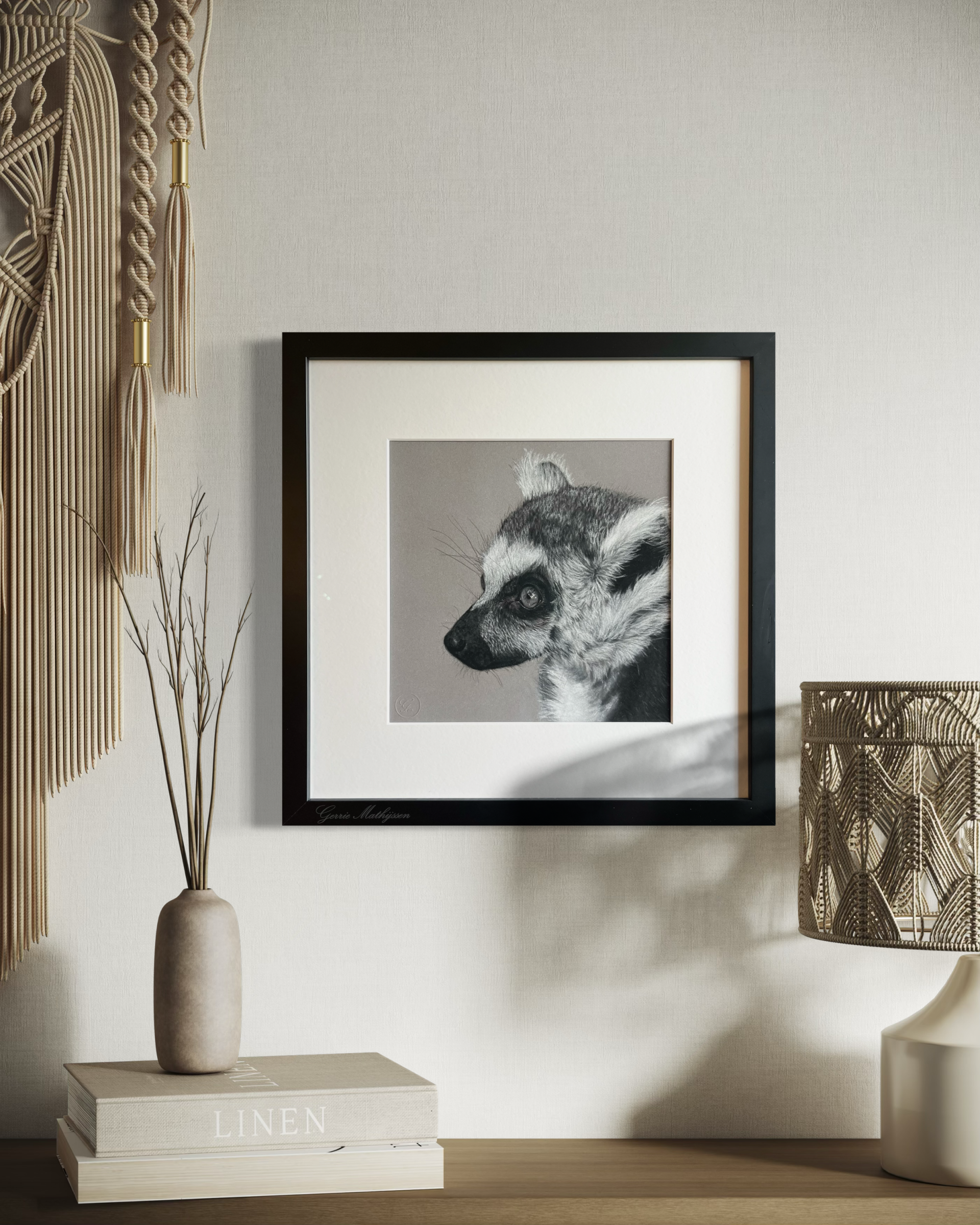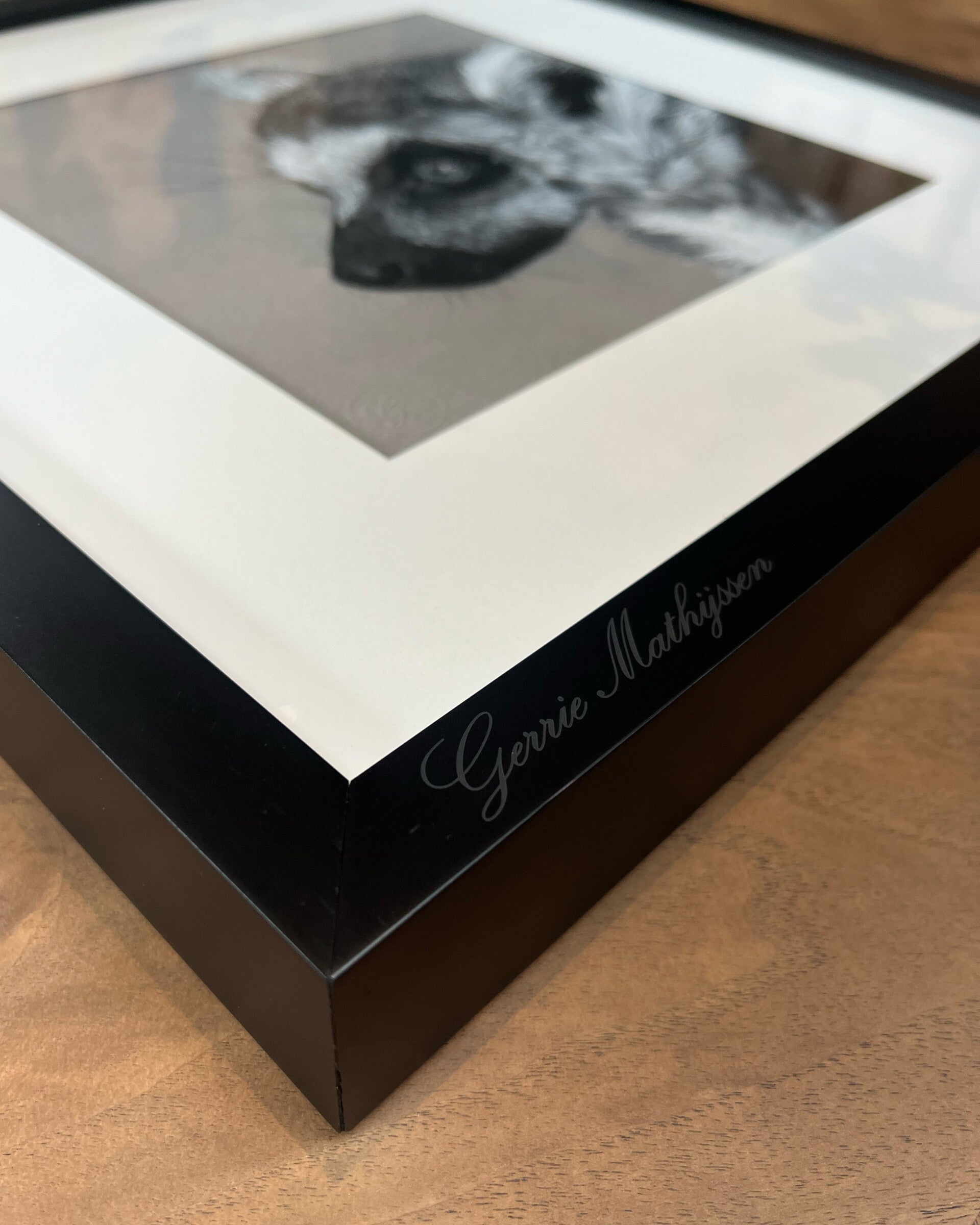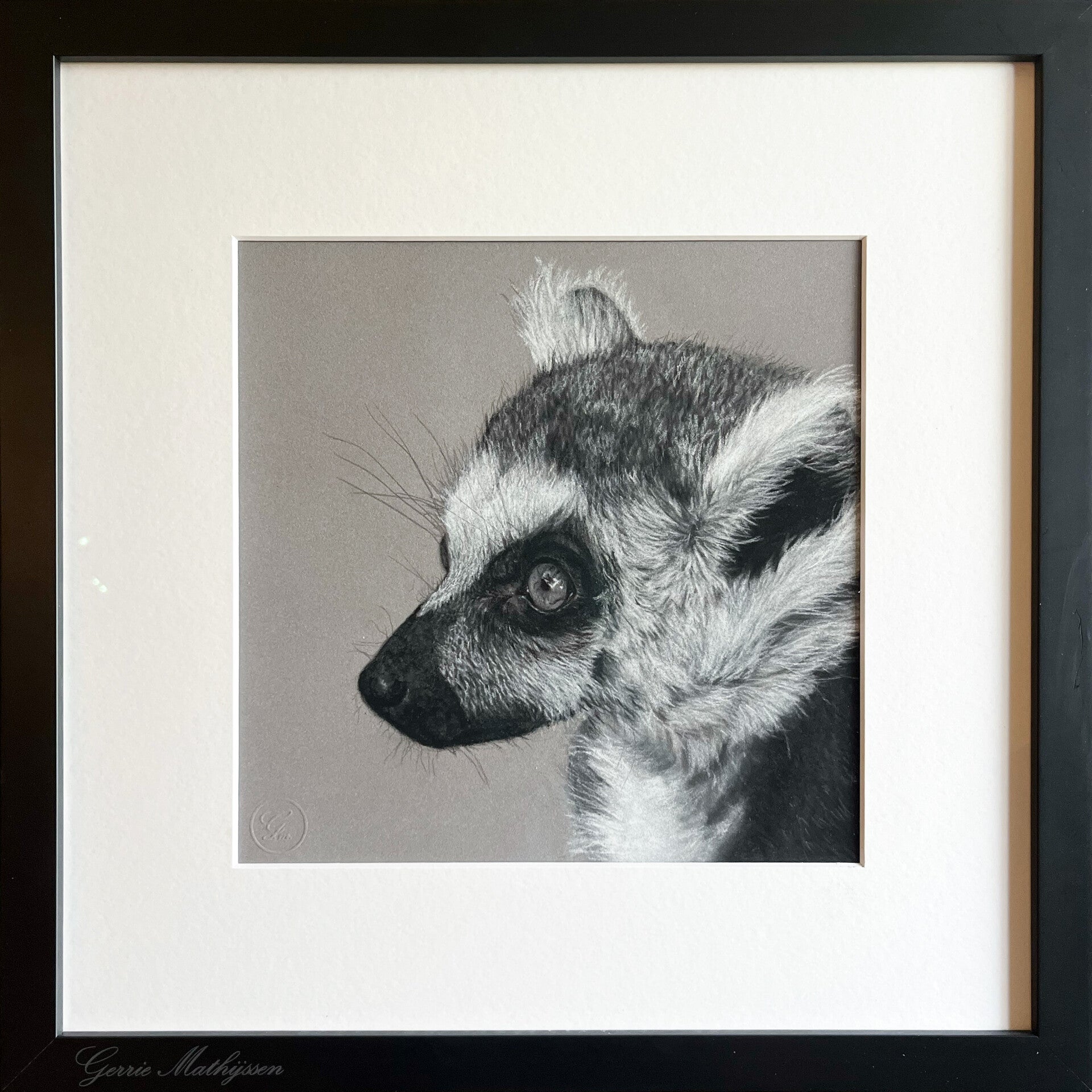 Het kunstwerk is professioneel ingelijst achter museumglas en klaar om op te hangen.
