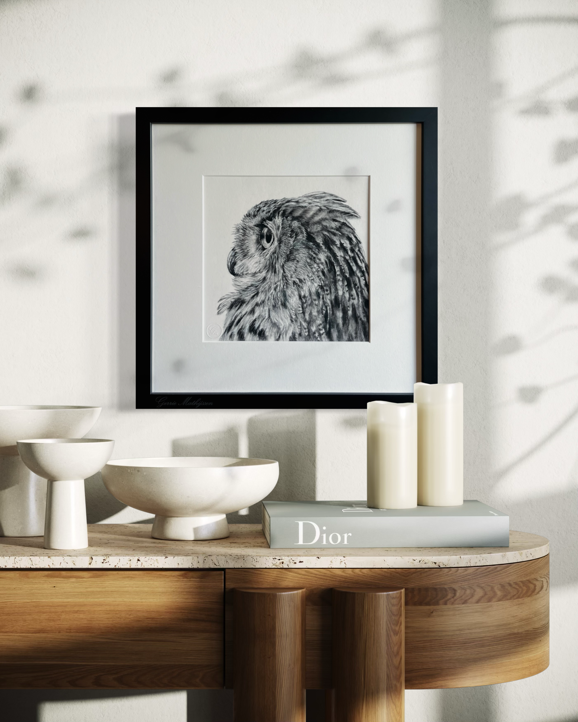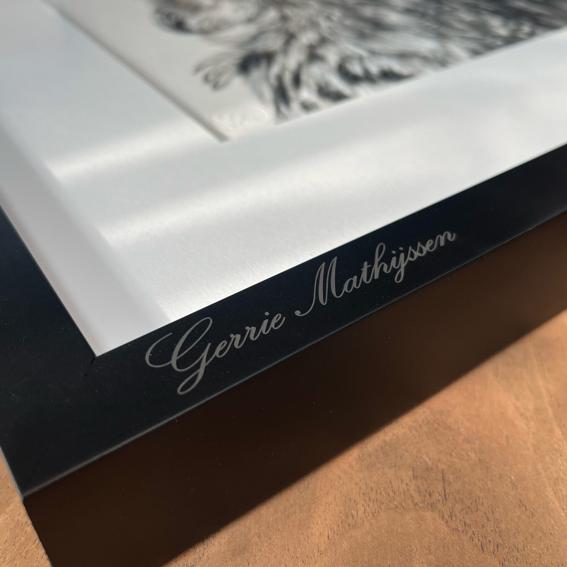Het kunstwerk is professioneel ingelijst achter museumglas en klaar om op te hangen.