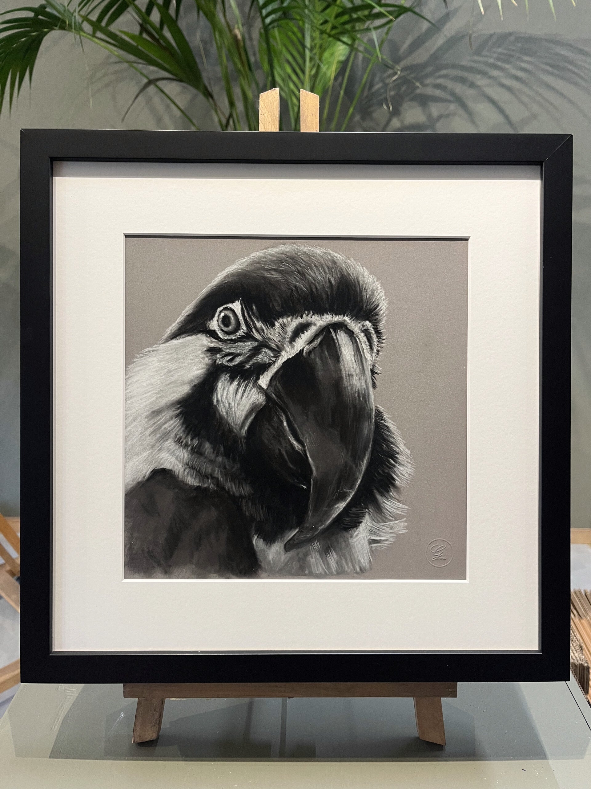 Het kunstwerk is professioneel ingelijst achter museumglas en klaar om op te hangen.