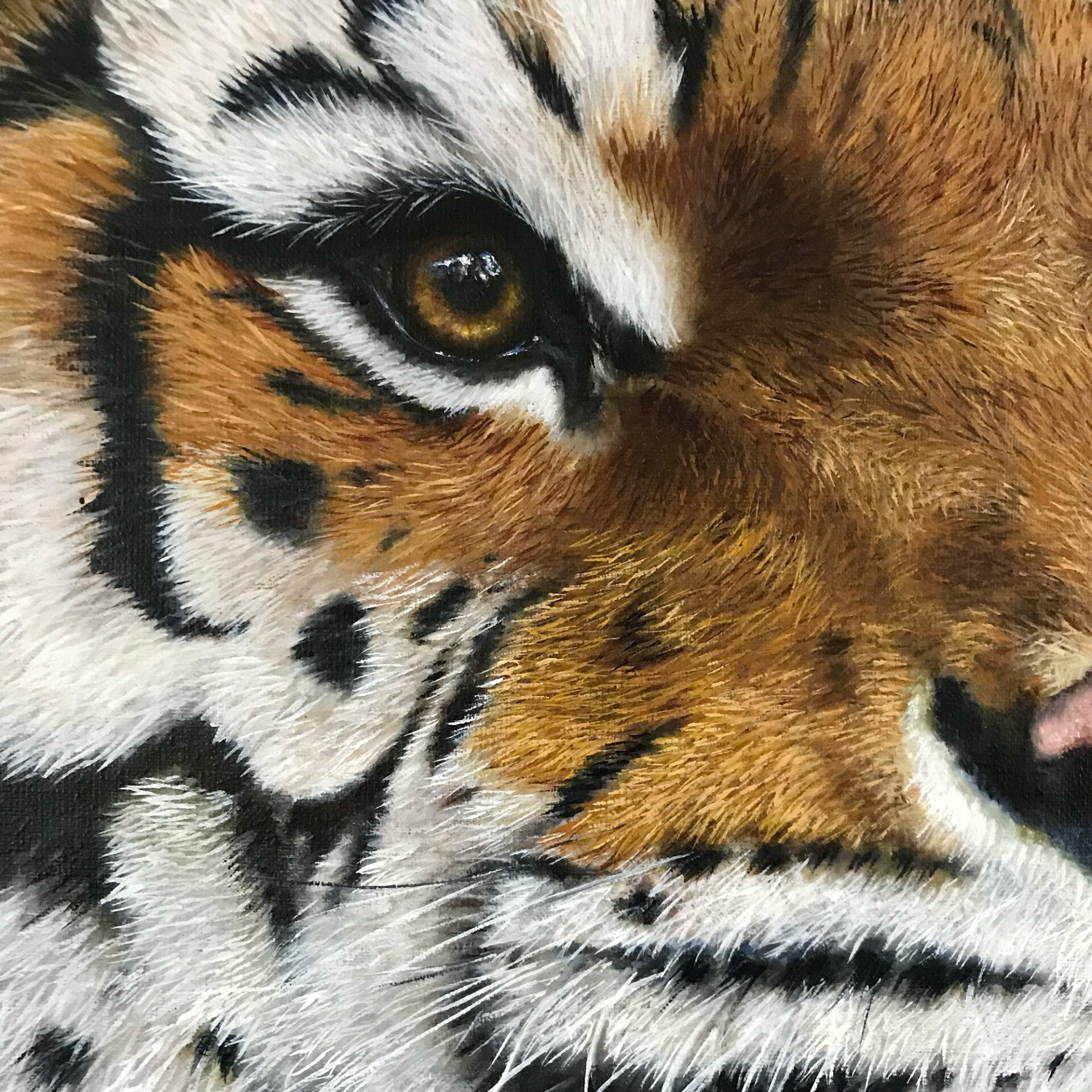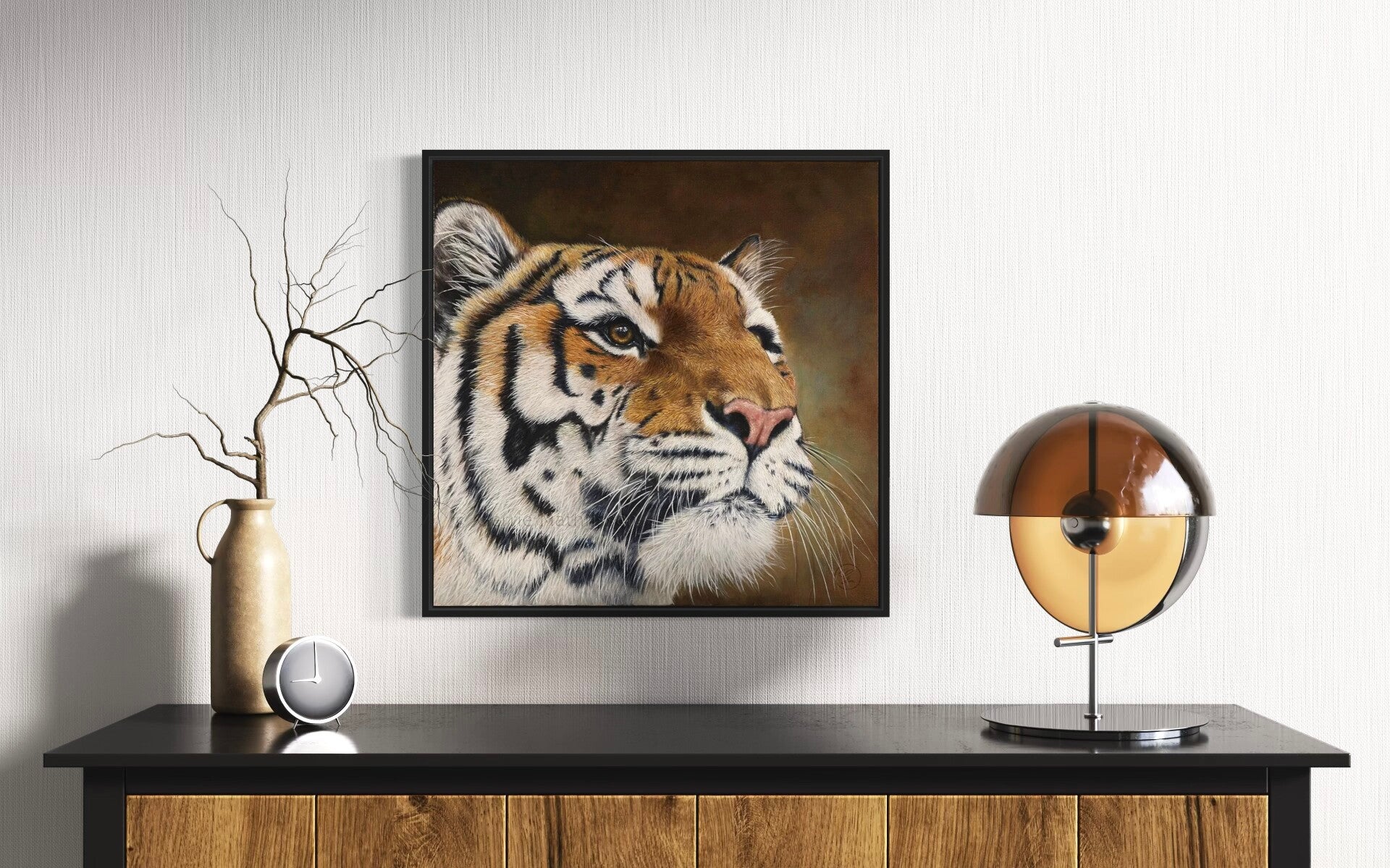Het majestueuze tijgerportret, ingelijst in een handgeschilderde zwarte baklijst, straalt elegantie uit. De intense blik van de tijger, gericht op de verte, wordt op indrukwekkende wijze weergegeven met gedetailleerde penseelstreken. De vacht is met zorg opgebouwd in vele lagen verf, waardoor het bijna voelbaar lijkt.