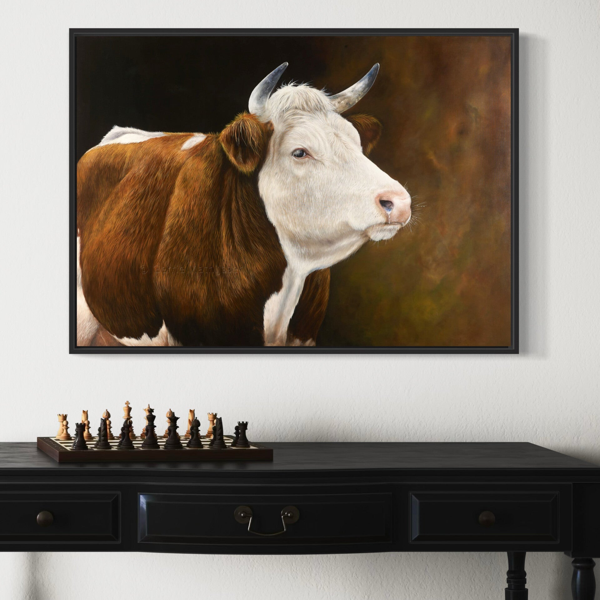 Breng warmte en rust in je interieur met deze prachtige giclée print op canvas van Margje de Koe. Deze roodbonte koe is met zorg en oog voor detail gereproduceerd vanaf het originele schilderij, met een zachte, warme achtergrond die een kalmerend effect heeft.
