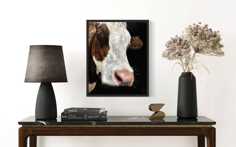 Elke penseelstreek weerspiegelt de tijd en aandacht die ik heb besteed aan het vangen van de essentie van deze koe. De glinsterende druppels op haar natte snoet en de levensechte details maken dit schilderij tot een opvallend en realistisch kunstwerk.